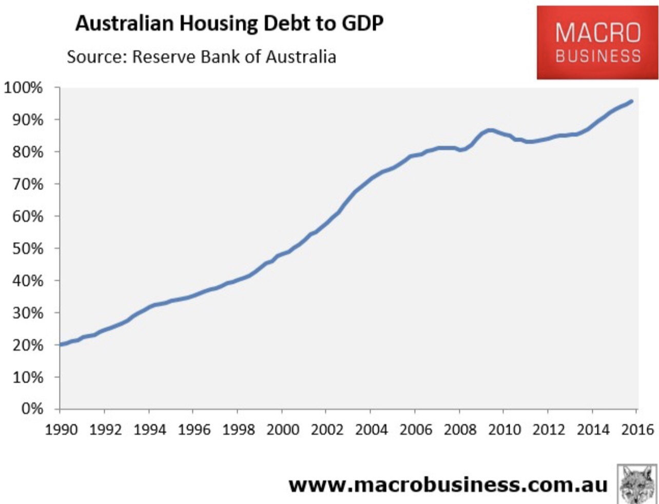 The Australian economy has been thriving on regular and steady increases in the level private debt / household debt for about 20 years. The reason is that the extension of credit by the banks to home buyers amounts to an expansion of the money supply and an expanding money supply makes for a happy economy (especially asset owners).