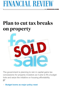 They seem to have made it very clear that they are not going to reduce the CGT discount on housing so I would not hold your breath waiting for that. Considering there is now talk of a FHB boost of some discription in the budget it seems clear that the government is keen to do whatever it can to keep house prices going up. Getting more households buried in mortgage debt is the objective as it reduces the size of the deficit that Mr Morrison needs to run to avoid a recession. Mr Morrison wants the household balance sheet to take lots of the load off his.