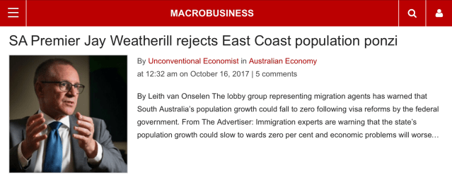 South Australian Premier Jay Weatherill correctly rejects a population Ponzi scheme as an economic plan for South Australia’s future.